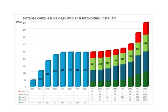 Il fotovoltaico in Provincia di Bolzano ha vissuto una fase di rapida crescita fino al 2013 grazie agli incentivi del "Conto Energia". La riduzione delle tariffe incentivanti nel periodo successivo ha portato ad una riduzione consistente del tasso di crescita annuale.